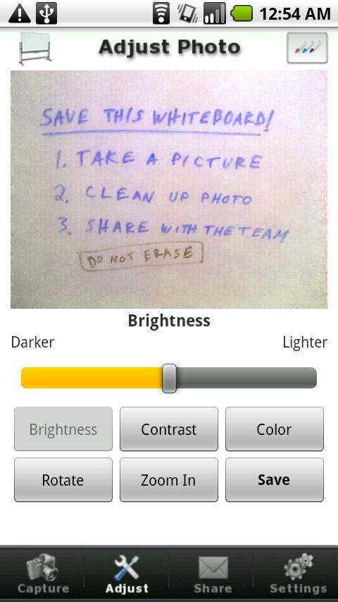 [Trial version supports capturing and sharing whiteboards, but not saving photo adjustments like contrast, brightness, red/green/blue color channels.]