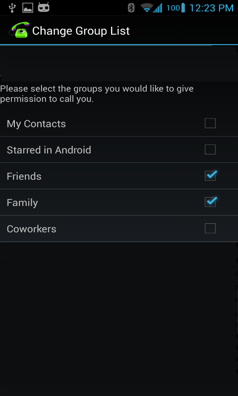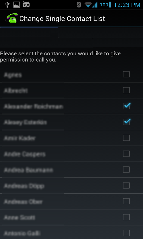 Whitelist Call Blocker is a call blocker, with that you can determine which callers reach you. So it is possible with activated Whitelist Call Blocker, that for example only the group "family" can reach you. All others only hear a busy signal. Of course, your phone will not ring if the caller is not a member of an allowed group to call you.