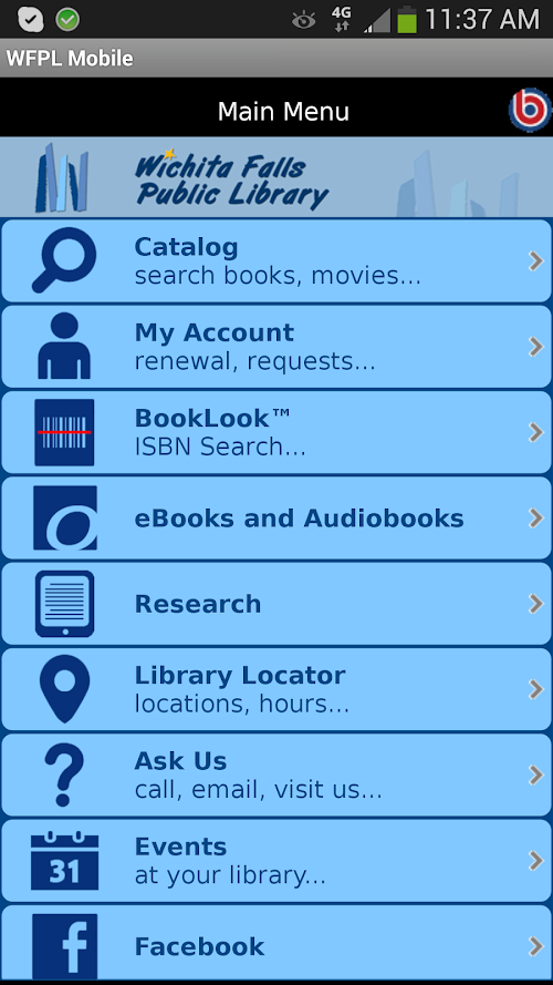 The Wichita Falls Public Library (WFPL) mobile app gives users access to the library’s catalog and their account. Access and download e-books and e-audio to your device in one step. Place materials on hold, renew borrowed items, check our hours, do a little research, or contact us. Scan the ISBN barcode of any book in a store to see if we have it in our collection.