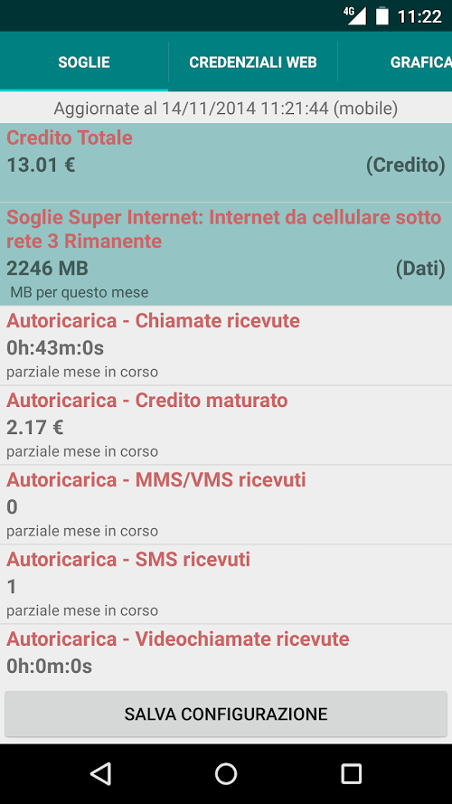 Widget che visualizza sull'home screen credito/minuti e traffico residuo di prepagate e abbonamenti 3.