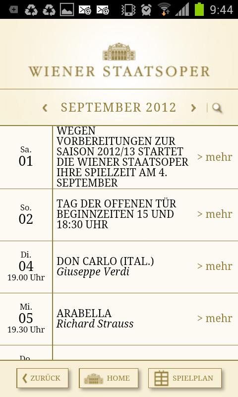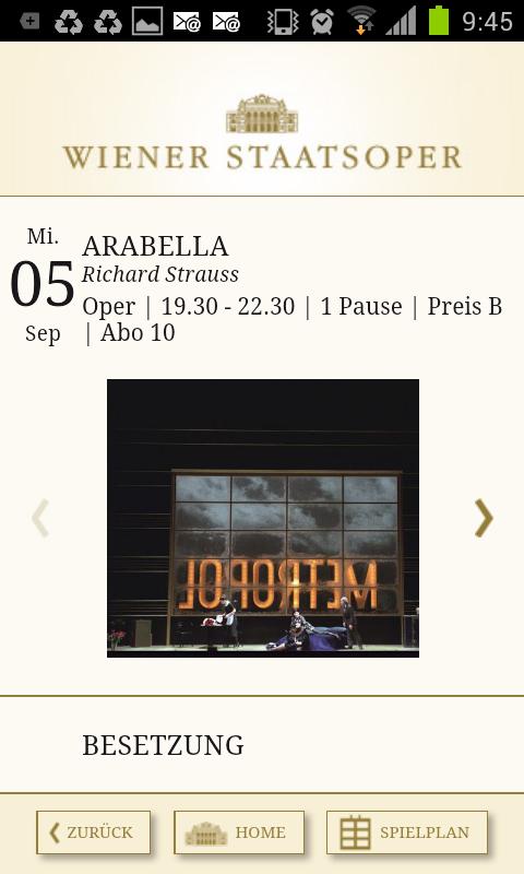 Die App der Wiener Staatsoper bietet Zugriff auf den Spielplan der gesamten Saison inklusive Besetzungen, Fotos und Videos. Darüber hinaus können kostenlose und kostenpflichtige Publikationen direkt in der App dargestellt und erworben werden. Abgerundet wird die App durch aktuelle Informationen und Hinweise zum Kartenkauf.