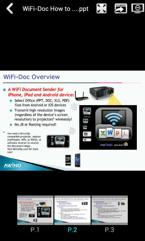 WiFi-Doc supports Microsoft PowerPoint, Word, Excel and PDF files. After installing this application on your mobile device, please connect your WiFi to the same network of the receiver (such as the PC running the MirrorOp receiver), select an office file, and then you will be ready for your own stylish “wireless” show! A quick “How to” PPT file is released with this application. Please take a look at it, and you will find how easy you can transfer your file to your mobile devices through our design!