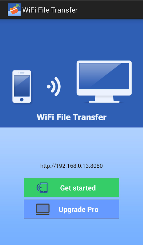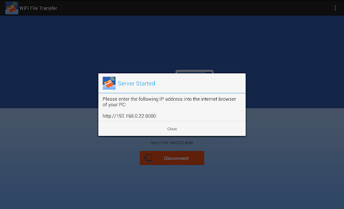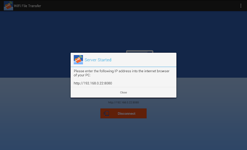 1. Open WiFi File Transfer app, tap "Get Started", an IP address window will popup.