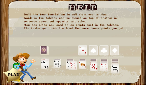 Build the foundations in Suit from Ace to King. Cards on the table can be played on top of other cards in sequence down, but opposite color. You can place any card on an empty spot.