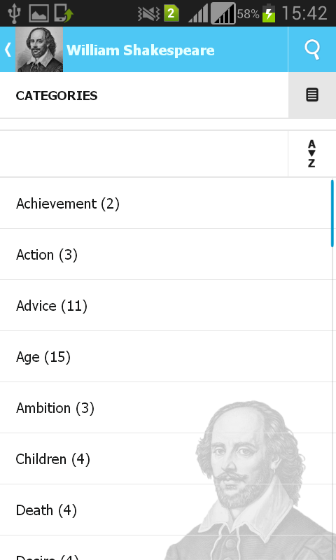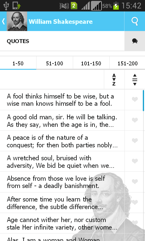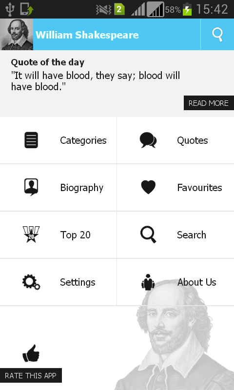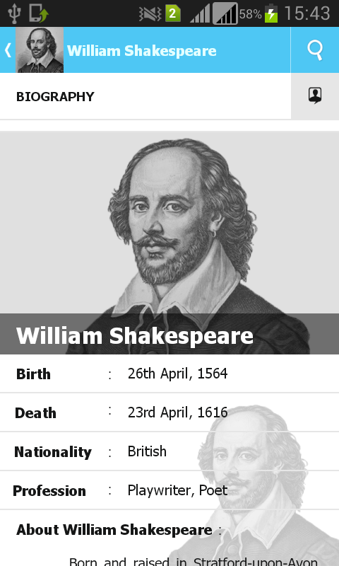 The Application contains a heart touching collection of William Shakespeare Quotes categorized in various subjects. Be motivated, or motivate others by reading/sharing most popular quotes of William Shakespeare. A great way to live a true daily life of achievements and pleasure with 'Quote of the Day' functionality.