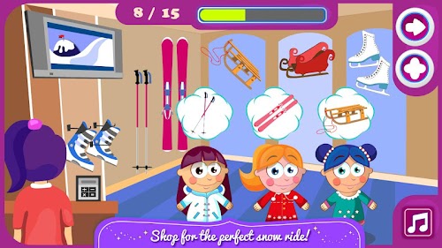 Ranging from a fun wintery management game (store simulation game), to a winter dress-up game, a decoration game, to a fun skills game, the 4 winter games for kids in our game app are meant to bring the joy into your blistering cold winter days! Linked by the sleigh's theme, once put together they build a nice winter story in 4 fun-filled chapters: