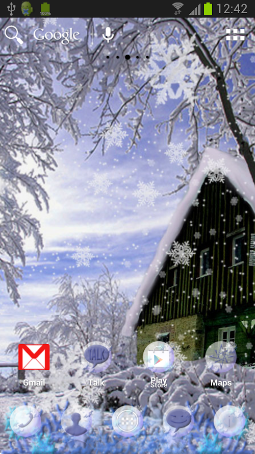 Winter theme shows hut covered with snow. On the wallpapers are also tree and falling snowflakes. Background of main menu application is also house and falling snowflakes. Each of icons contains white and transparent wheel. More important icons have been changed to blue and white. Application is perfect to winter which is coming. If you like this motif check our other application with the same theme.