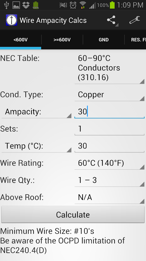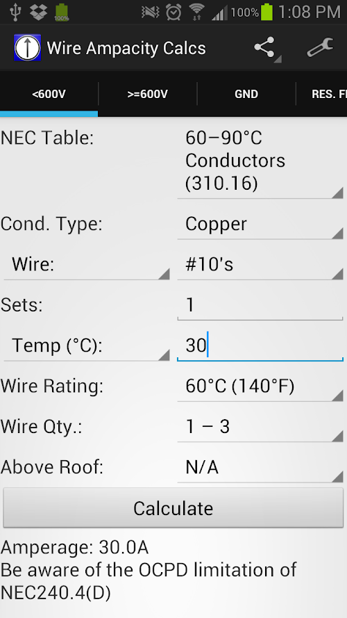 This app will calculate the minimum wire or max amps based on the inputted ampacity for low voltage wire. The calculations are base on the 2008, 2011 and 2014 National Electric Code (NEC).