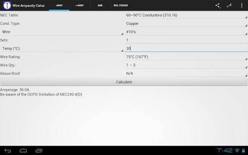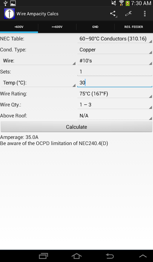 Note: The app is called Wire Ampacity and not Circuit Ampacity. This app does not specify the size of an over-current device, simply the AMPACITY of the wire (i.e. #14 75 degree wire has an ampacity of 20A, but should not be used with a 20A breaker).