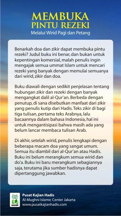 saja, terutama jika sumber hadisnya. Is it true that prayer and remembrance can open the doors of sustenance? The title of this book is true, and not for commercial purposes, even the author would like to invite all Muslims to seek sustenance that much to start everything from wird, remembrance and prayer.