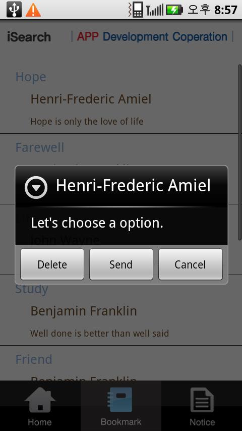 2.when you see the bookmark, if you long press one of the list, you can delete that or send a email ( Default setting : my e-mail address)