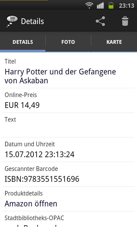 If you choose to scan a barcode (EAN, UPC or ISBN) and the product is listed on Amazon (or Google books), the app will try to automatically show you the product's name, price and even download a picture!