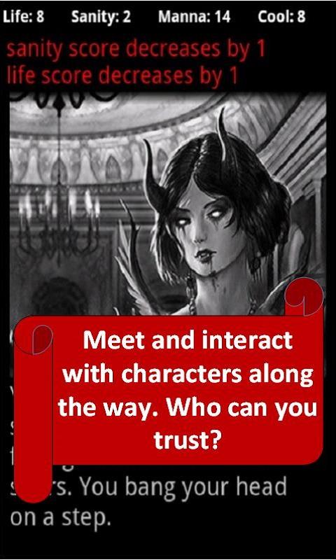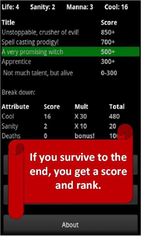 - Your decisions determine the story line as well as the scores of Life, Manna (your witch magical powers), Sanity, and Cool.