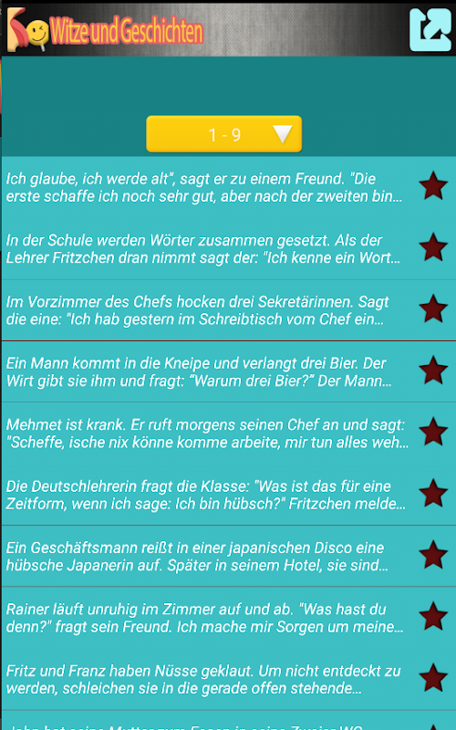 All children, doctor jokes, alcohol sayings, wisdom, farmers, civil servants, beer, blonde, office, computers, football, lawyers, children, flat jokes, churches, musicians, East Frisians, politicians, school, soldiers, Others jokes, sports, animals, holidays The jokes are divided into 37 categories, Dirty Jokes, Viagra, Chuck Norris, GDR jokes, sms sayings.
