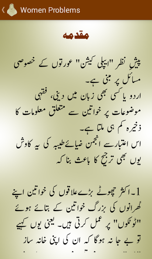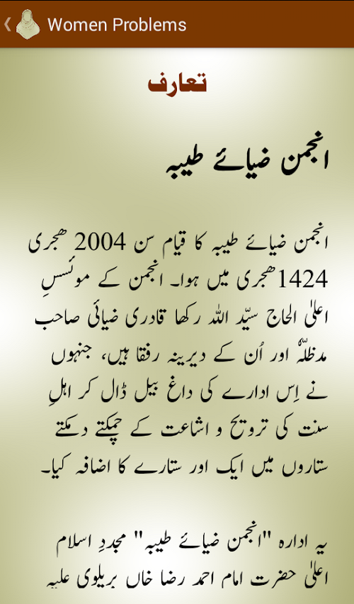 The mobile app under view is basically all about the problems and the solutions of women. There is a dearth of the books in Urdu or in any other language regarding the issues of females and their solutions through Quran, Hadith and Sunnah. In this concern the efforts of Anjuman Zia-e-Taiba are very preferable.