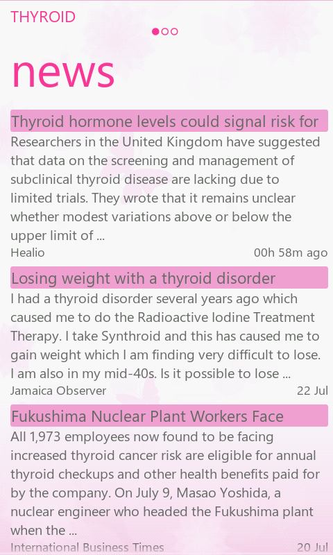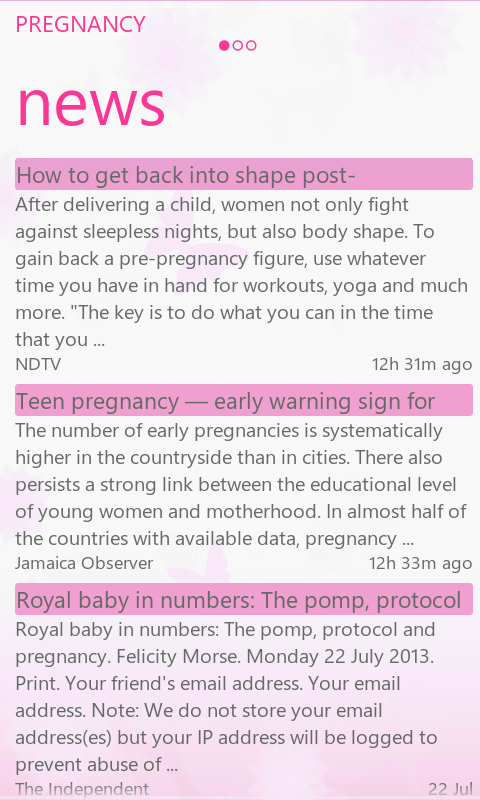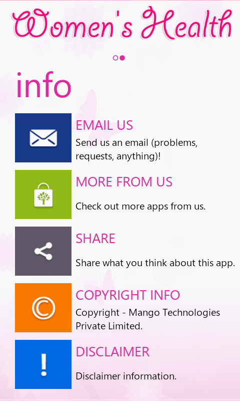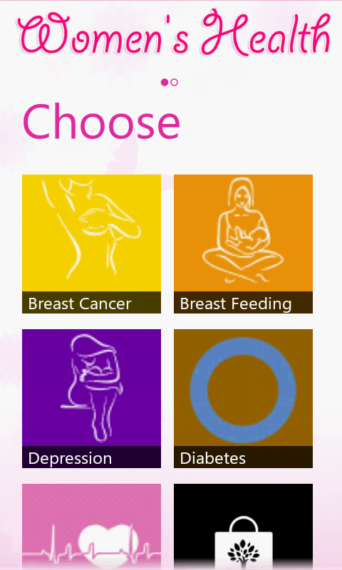 Along with Alzheimer, Breast Cancer, Depression, Diabetes, Heart Disease, Melanoma, Osteoporosis, Strokes, Thyroid, Urinary Tract Infection, app also features news and articles on Pregnancy and Breast Feeding.