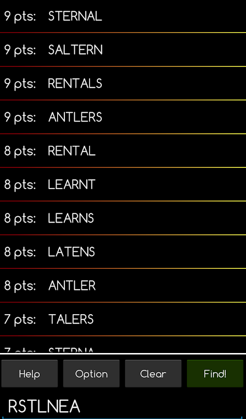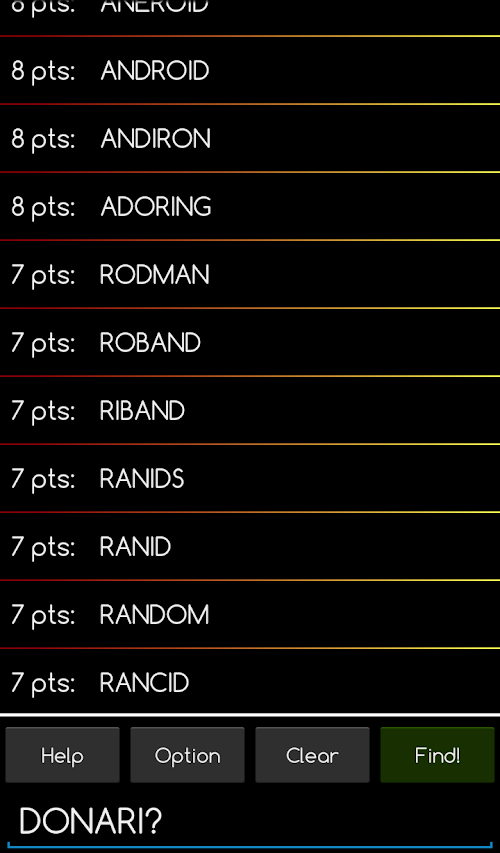 - Uses the Words With Friends dictionary, so all words generated are accepted!