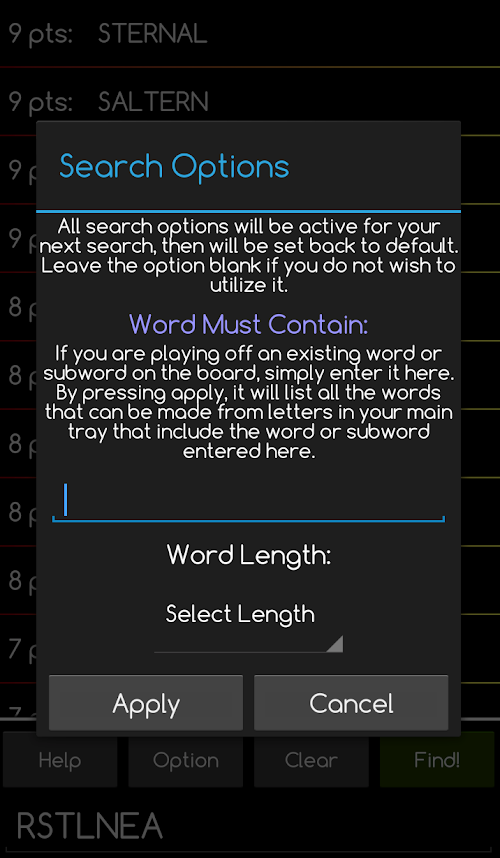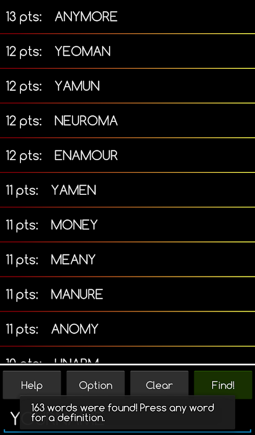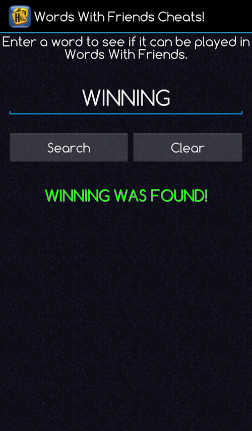 Need help finding a word in Words With Friends? This app will generate all possible words based on the letters you give it. ALL words that this app generates will work with Words With Friends! This app is also extremely useful with games like Wordfeud, WordWise, WordSmith, Word Pirates, and DroidWords. This is also handy for the new Words With Friends Board Game! Here are the features: