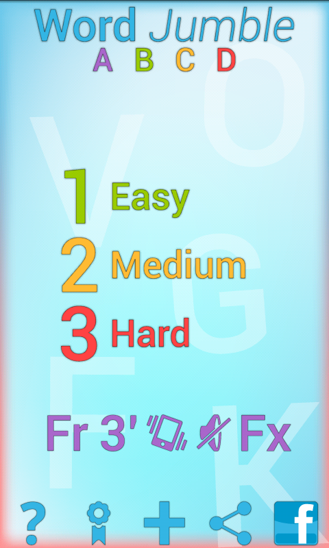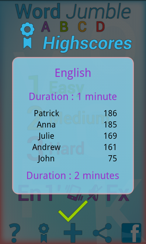 With its 3 progressive game modes, its 5 durations available and its tens of thousands of words in French and English, Word Jumble Free will suits everyone, from 3 to 103 years old.