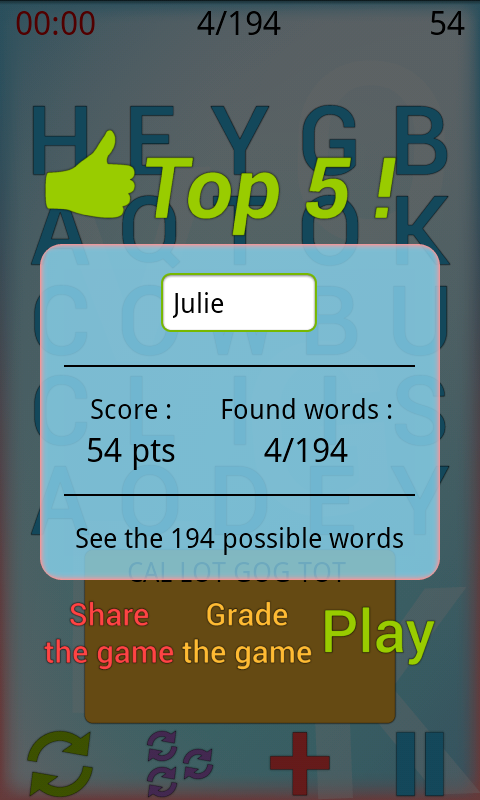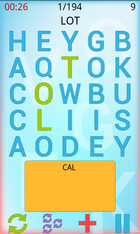 Start now a new random grid of 25 scramble letters, and be ready ! Search scramble words by sliding from letter to letter and hold a series of bonuses, thanks to the rare and reused letters, and other levels !