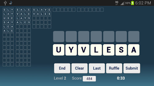 There are three levels in each game, each three minutes long (or the time you set initially). In the first level you have six letters to form words from, in the second, seven letters and in the third, eight letters. In order to progress to the next level, you need to score a certain percentage of points on offer or find the word that uses all the letters.