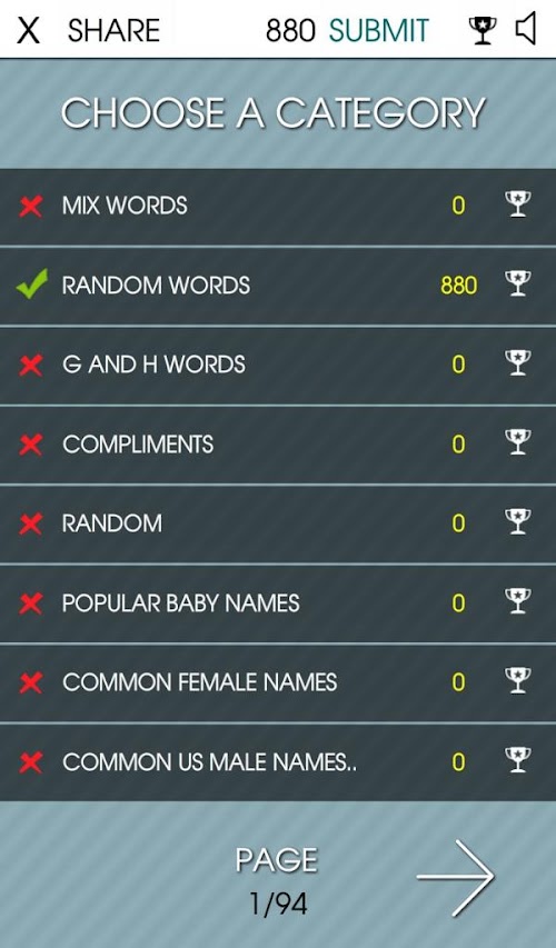 * Review results of other people - tap on the trophy icon on "Select a category" screen