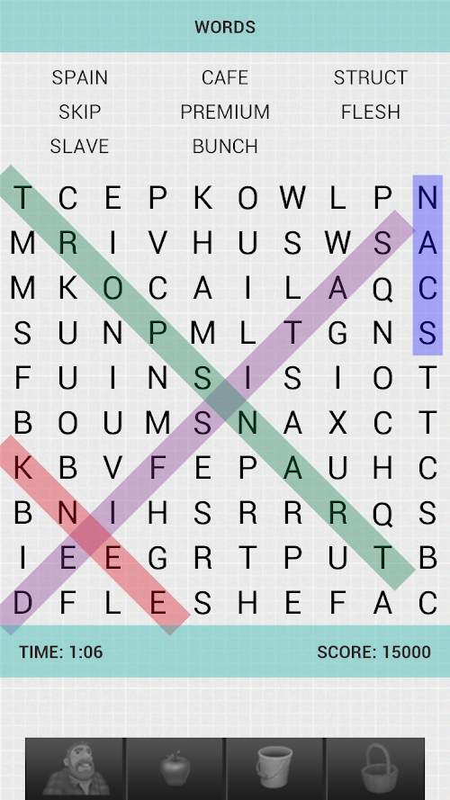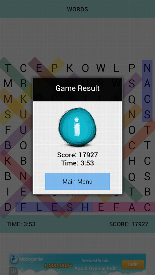 Score is calculated based on the length of the found words and the elapsed time. When you find all the words in the puzzle, the score is sent to the online scoreboard on Google+. You can see the best players daily, weekly or for all times.