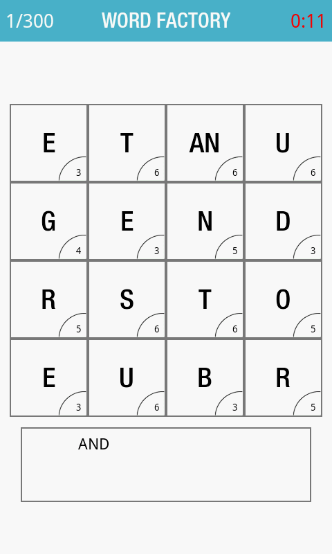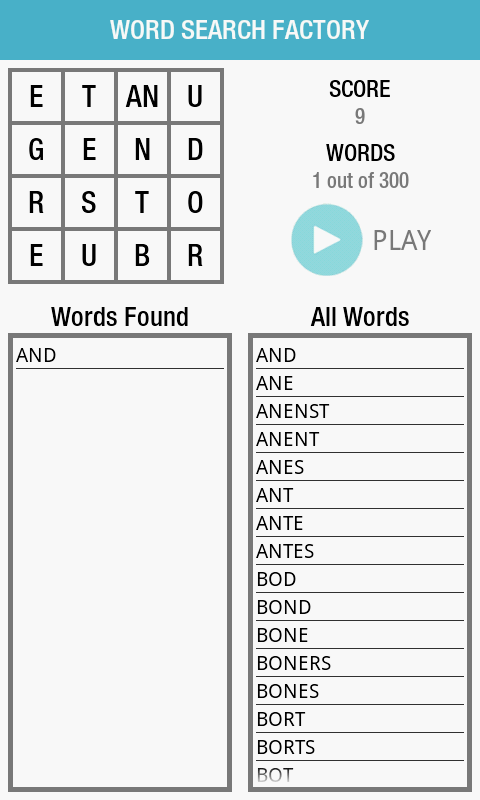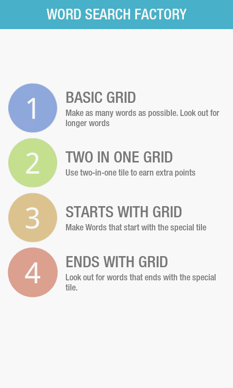 Enhance your vocabulary with unlimited number of dictionary word puzzles.Word Search Factory is a fantastic educational game with a grid of 4x4 cubes. Connect cubes to find as many words as you can.