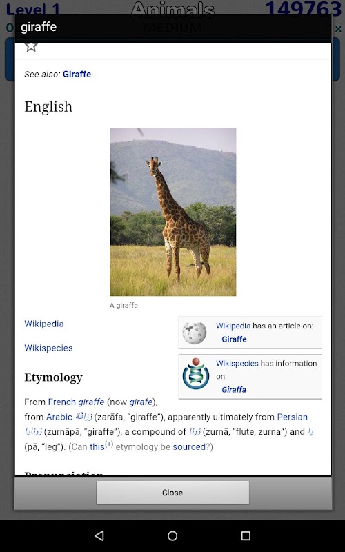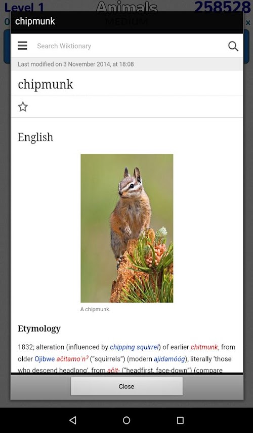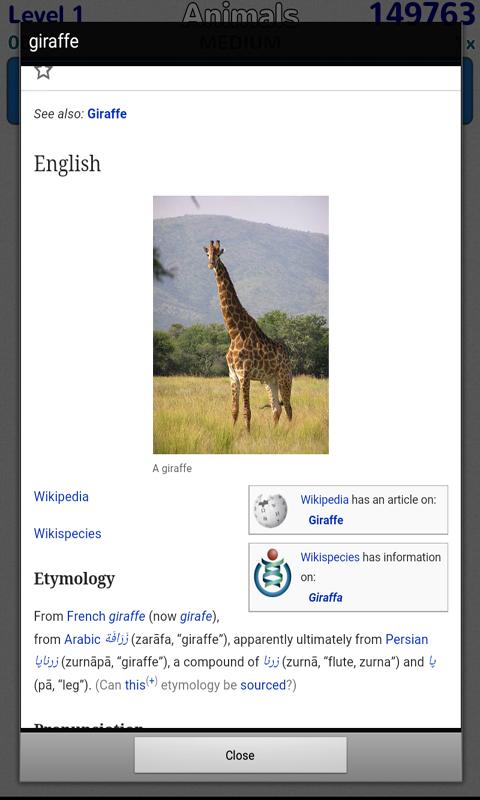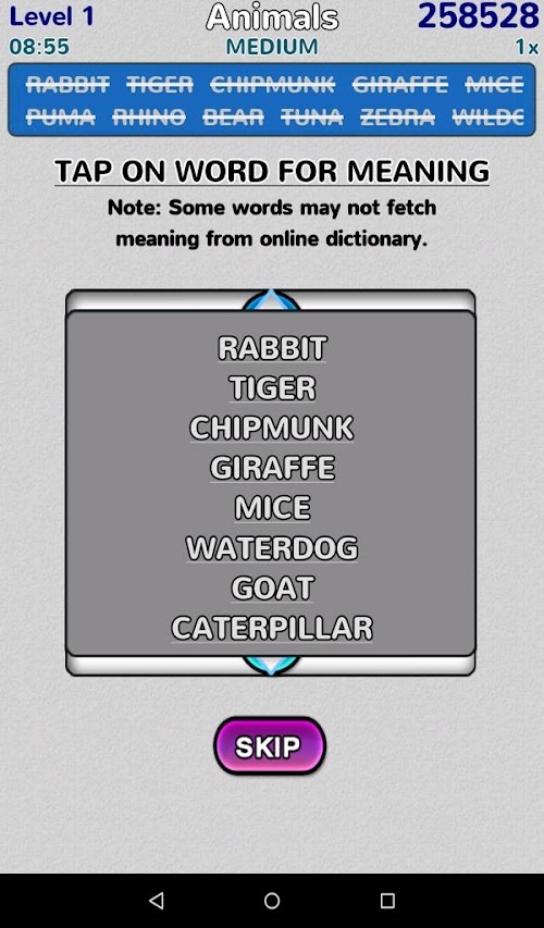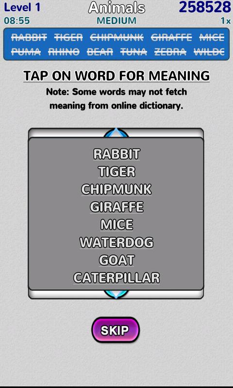Unique Words with meaning - All the default game packs have unique non repetitive words with access to the meaning of them after level completion.