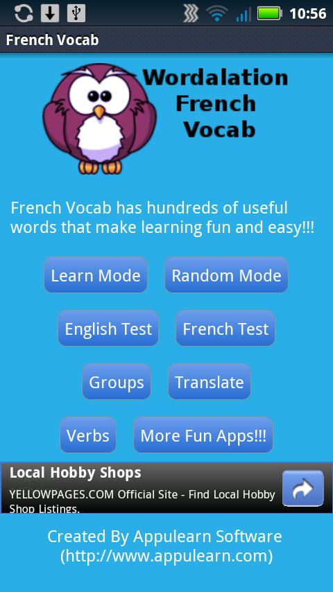 Wordalation French Vocab makes learning French vocabulary fun and easy. Using a flashcard interface, students can quickly learn hundreds of everyday French vocabulary. Words are grouped into common themes that include numbers, moods, body parts, professions and much more! There are various modes that include test mode, learn mode and random mode.