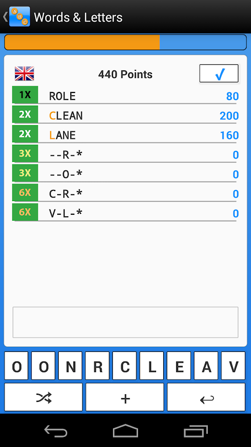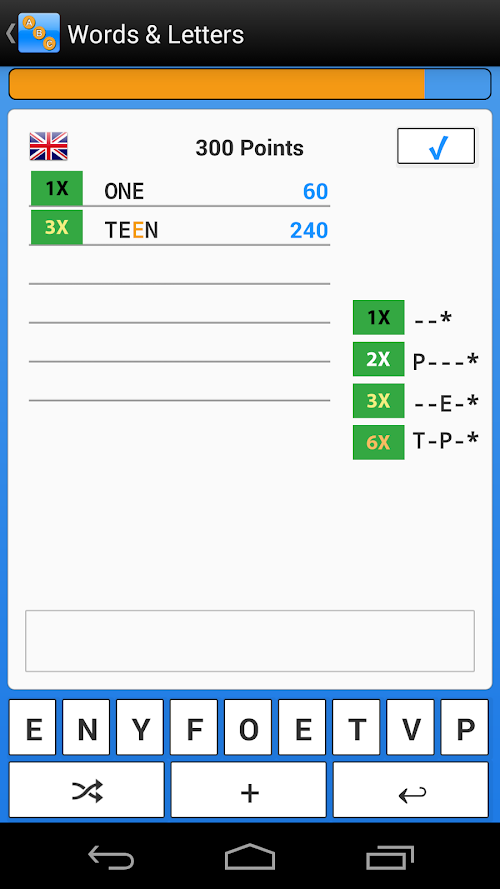 - Unlimited Words List: you have 150 seconds to write as many words as you can. Patterns 2X, 3X and 6X multiply the score of the word. Wrong words decrease score.