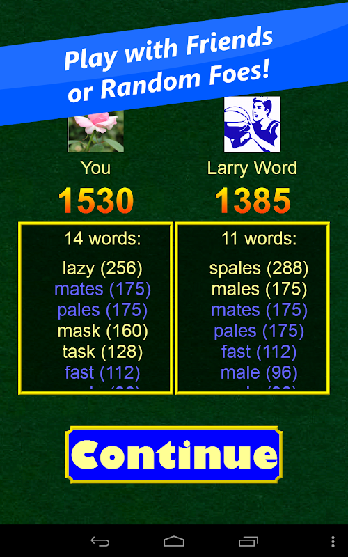 WordSlide Battle combines the unique gameplay of the highly-rated WordSlide with the multiplayer abilities players have been asking for. Invite a friend to play online or let WordSlide Battle match you against a random opponent. You can even pass your phone or tablet back and forth with a friend for an offline game.