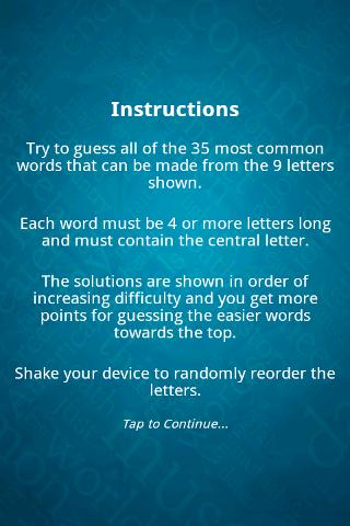 The objective of the game is to try to guess all of the 35 most common words that can be made from the 9 letters shown. Each word must be 4 or more letters long and must contain the central letter.