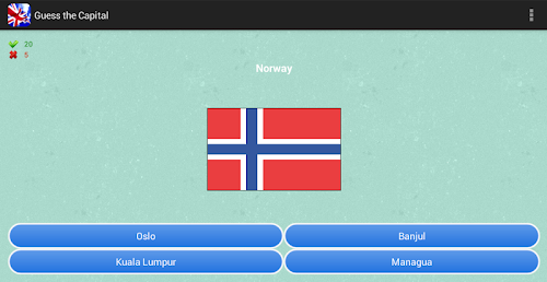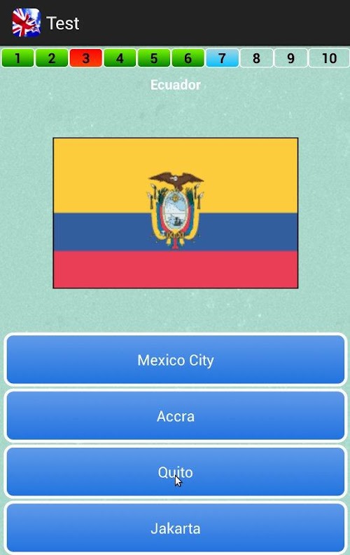 This free application is recommended who loves geography and wants to test himself in the knowledge of world capitals. The user must guess capital city or country of four variants. If you find inaccuracies, errors, bugs or just want to give advice to improve this application, please send e-mail to developer [email protected]. Your opinion is very important!