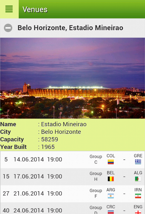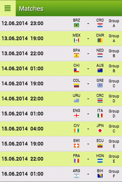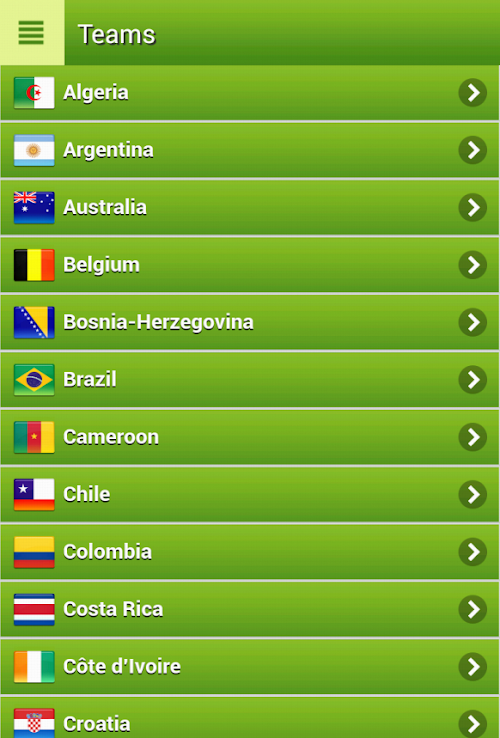 - Teams information (Brazil, Germany, Algeria, Australia, Belgium, Bosnia and Herzegovina, Cameroon, Colombia, South Korea, Ivory Coast, Croatia, Ecuador, Spain, USA, France, Ghana, Greece , Holland, England, Iran, Italy, Japan, Mexico, Nigeria, Russia, Switzerland, Uruguay, Chile, Costa Rica, Honduras, Argentina, Portugal.)