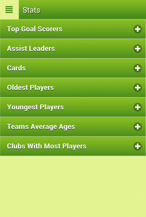 - Stats (Top Scorers, Assists, Yellow and Red Cards, Most Aged Player, Youngest Player, Team Stats)