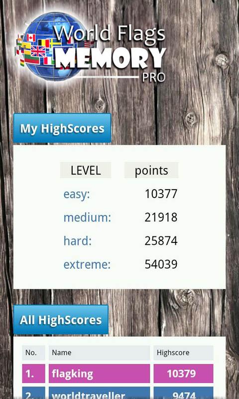 A high score table shows your points for every level and you can also submit your score to the online high score list. This makes the World Flags Memory Game a fun challenge!