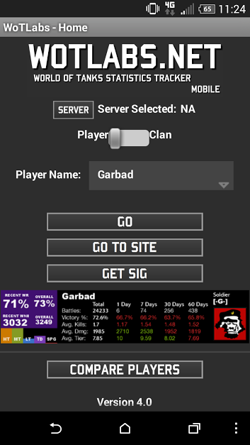 It includes a Get Signature function to quickly look up the WotLabs signature of any player. It also allows you to compare the stats of 2 players from the same or different servers.