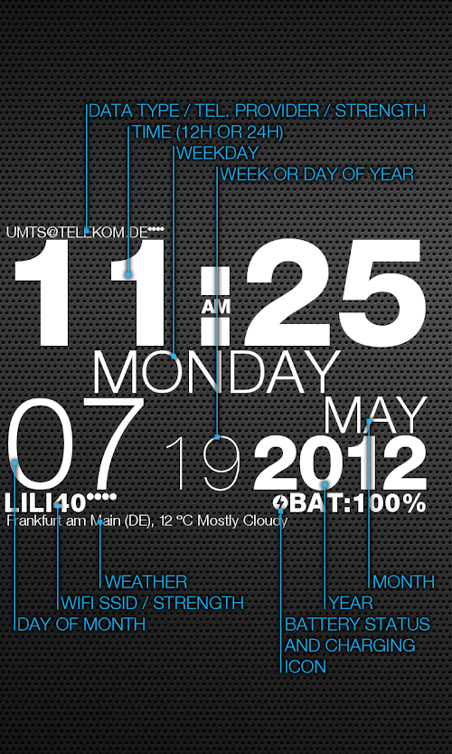 this stylish design live wallpaper clock will display a lot of useful informations directly on your home screen: