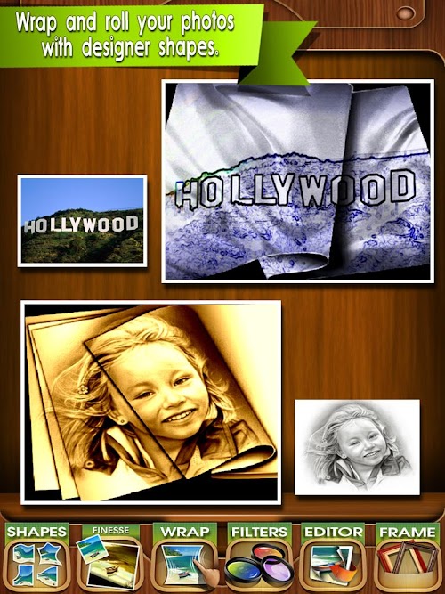 Wrap photo with your finger: Twist, turn, stretch and drag your photo like cloth. Swipe fingers over the photo to wrap it in your own customized way!