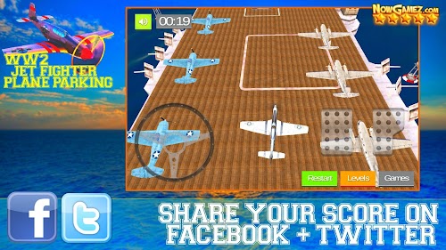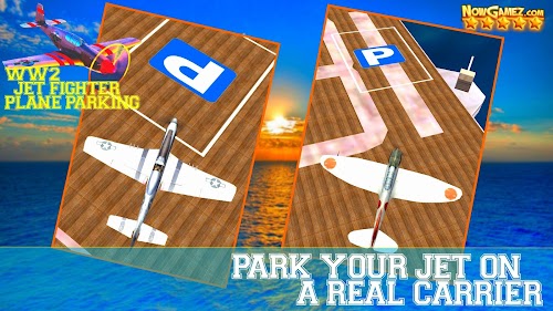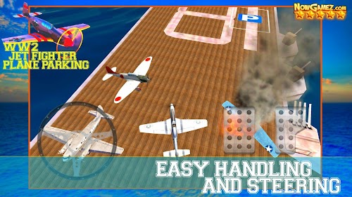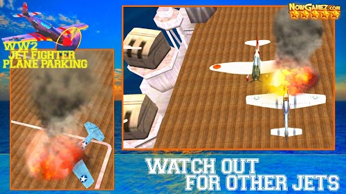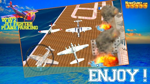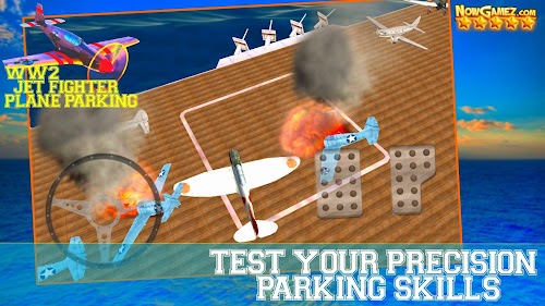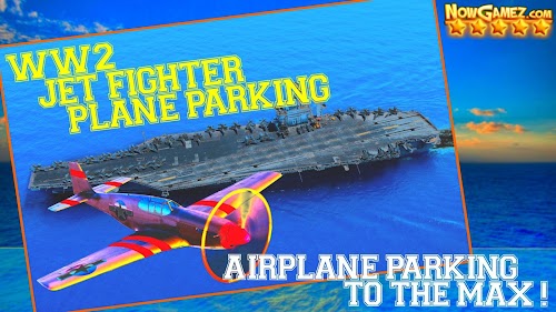 This time you are not on an airport but you start parking your jet fighter on a real 3D WW2 jet fighter carrier. Get behind the wheels of a real jet fighter airplane and find your way on the deck of the carrier. Steer your airplane between some burning jet fighters and be careful you won't hit anyone. With easy steering and handling this airplane simulator game gives you the feeling that you are the pilot and that you control your own WW2 jet fighter airplane. From the watch tower and control center, flight control will give you instructions where to park the jet fighter. Soon you will find your parking area.