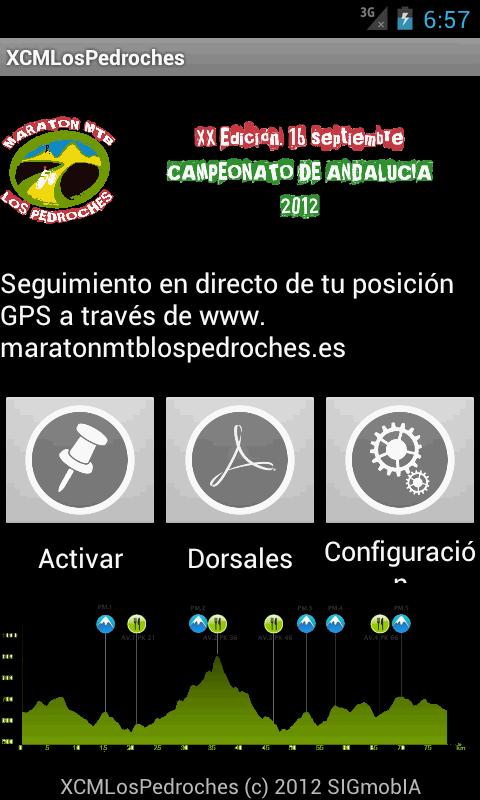 Con esta aplicación, cualquier participante de la XX Maratón MTB Los Pedroches (Campeonato de Andalucía 2012) podrá ser seguido en directo mediante su posición GPS a través de la WEB de la prueba: www.maratonmtblospedroches.es (Dentro de Recorrido - Seguimiento en directo).