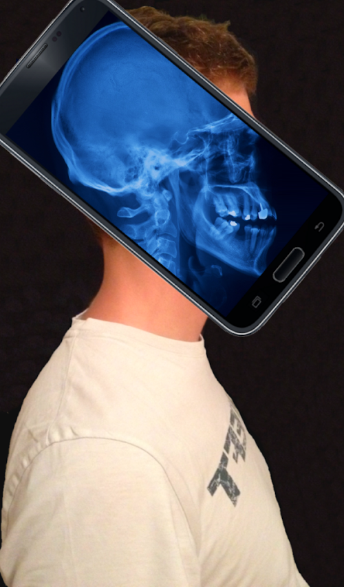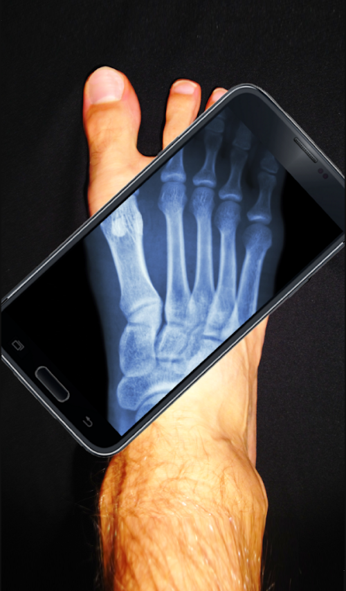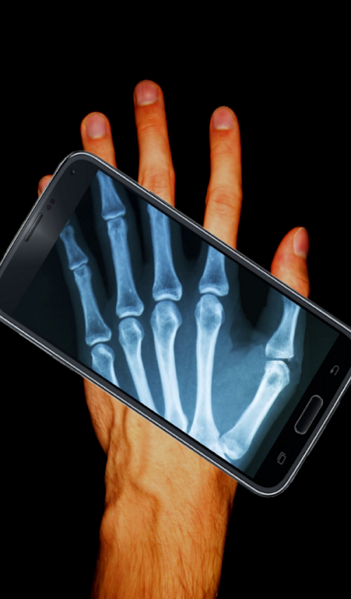 Select the body part you want to scan. Place your phone in front of that body part. This tool will display part of earlier prepared image of skeletal body part on your phone’s screen.  To move to another part of roentgen photo, tilt your phone in the direction you want to go. App uses accelerometer to detect phone tilt angle, and based on given information it moves photo in proper direction. For better performance you can adjust tilt angle sensitivity, picture move speed and body part size in settings. Moreover you can use view reset button, which will reset phone's tilt angle to the actual position of the phone. It will let you scan a person who is sitting, lying or standing. After taking some time to get accustomed to the app, you can try to prank your friends and make an X-Ray scan on their hands, legs, head or chest.