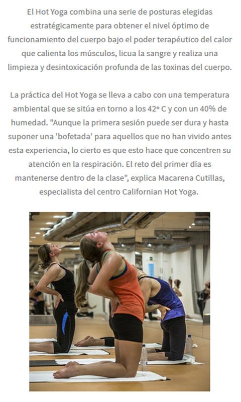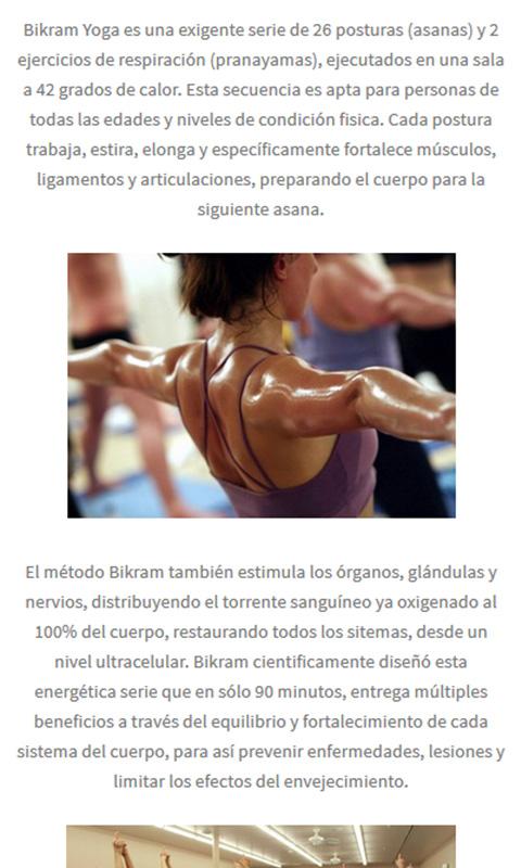 Bikram Yoga es un sistema de yoga que Bikram Choudhury sintetizó a partir de técnicas de hatha yoga tradicional y popularizó a partir de principios de 1970. Todas las clases de yoga Bikram tienen una duración de 90 minutos y consisten en la misma serie de 26 posturas, incluyendo dos ejercicios de respiración. Bikram Yoga se practica idealmente en una habitación calentada a 40.6 °C (≈105 °F) con una humedad del 40%.5 Todas las clases de Bikram son oficialmente sólo impartidas por maestros certificados de Bikram, que han completado nueve semanas de entrenamiento intensivo aprobado por Bikram. Los maestros certificados Bikram están obligados a recitar el diálogo Bikram literalmente en todas las clases de Bikram mientras está de pie en un podio en el frente de la habitación.Bikram Yoga is a system of yoga that Bikram Choudhury synthesized from traditional hatha yoga techniques and popularized beginning in early 1970. All Bikram yoga classes last for 90 minutes and consist of the same series of 26 postures, including two breathing exercises. Bikram Yoga is ideally practiced in a heated to 40.6 ° C (≈ 105 ° F) with a humidity of 40% .5 room All Bikram classes are officially just taught by certified Bikram teachers who have completed nine weeks of intensive training approved by Bikram. Bikram Certified teachers are required to recite the dialogue literally Bikram Bikram classes all while standing on a podium in the front of the room.