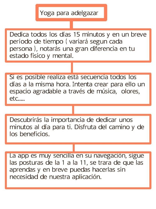 Aunque si el objetivo es exclusivamente adelgazar, con esta aplicación hemos seleccionado una serie de posturas que aceleran ese proceso. Es importante en ese caso que se informe sobre qué estilos de yoga existen, para elegir uno exigente y vigoroso, o que se busque formas de ejercitarse más efectivas. El yoga verdadero seguirá siempre el principio de ahimsa, o no-violencia, por lo que respetará los procesos y límites del cuerpo y también tendrá un componente místico.