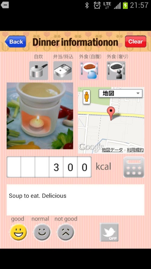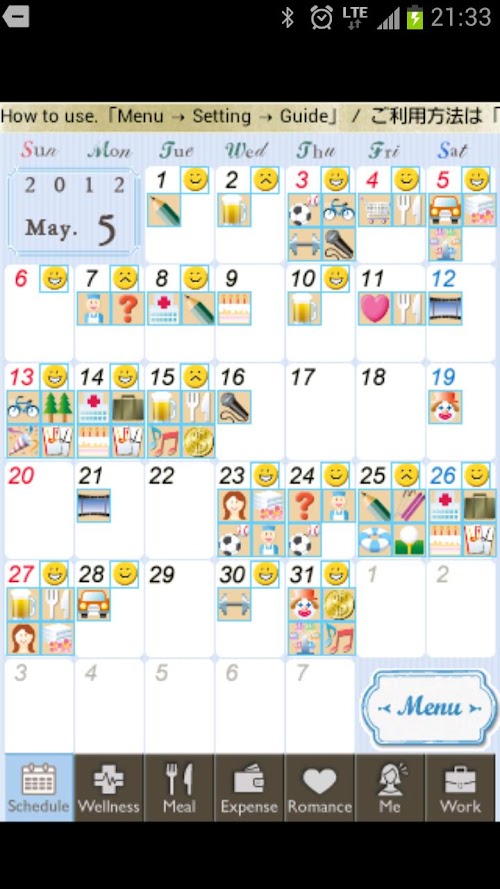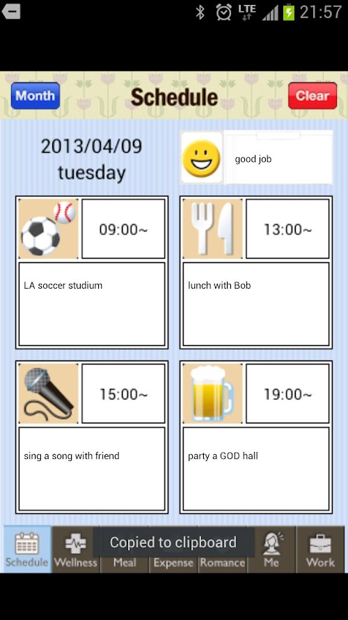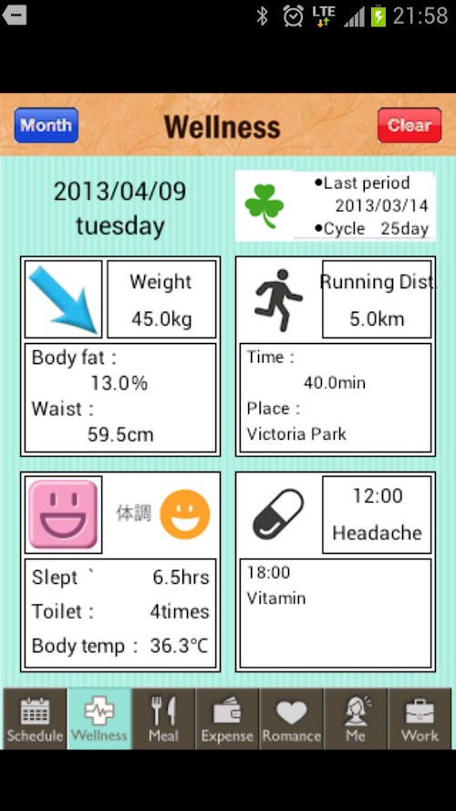 “Yokubari diary” is an application of diary/calendar/journey that allows users to record all of the information women need, for example, schedule, health, meal, diet, spending, dating, self portrait, working, scrap.