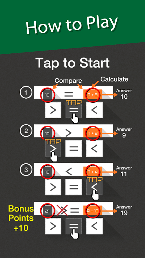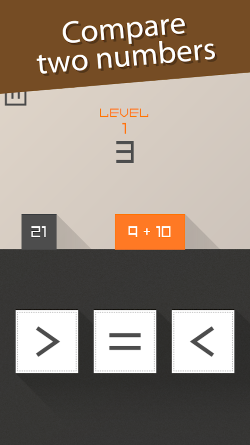 Add up the numbers in the orange box sliding in from the right and compare the total with the number in the black box on the left. Then tap the correct button from the three buttons below!
