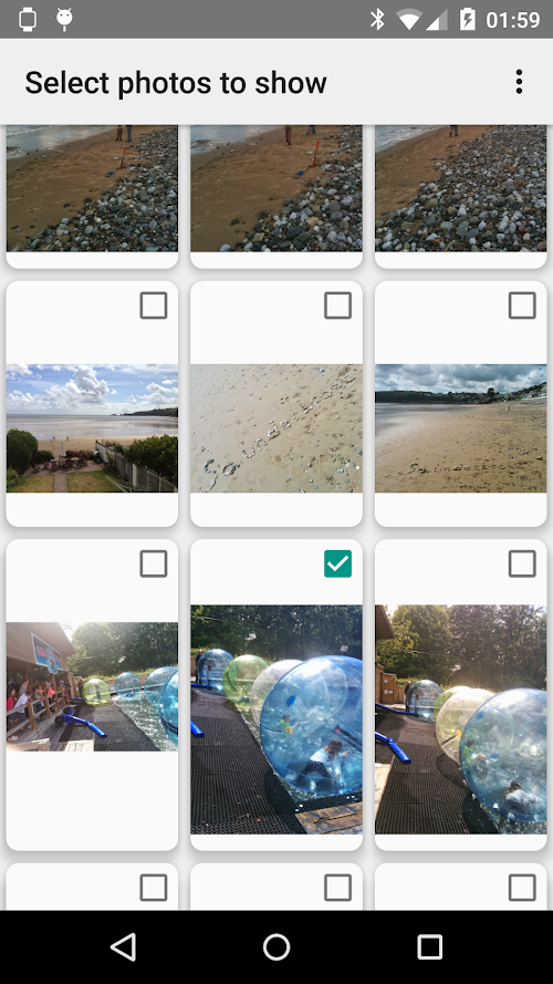 Choose from any photos currently on your phone, or from your previous Google cloud backups, Google+ shares or Picasa albums. Set up can be done in seconds and the pictures viewed straight away.