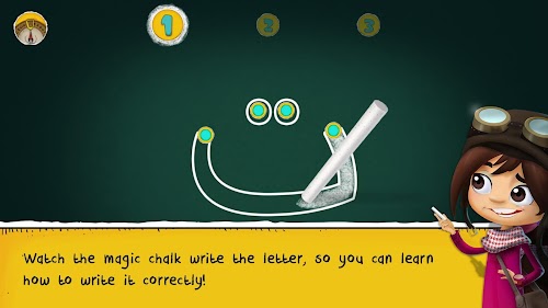 Follow the magic chalk with your finger as you learn to trace the Arabic alphabet with the help of animated arrows.
