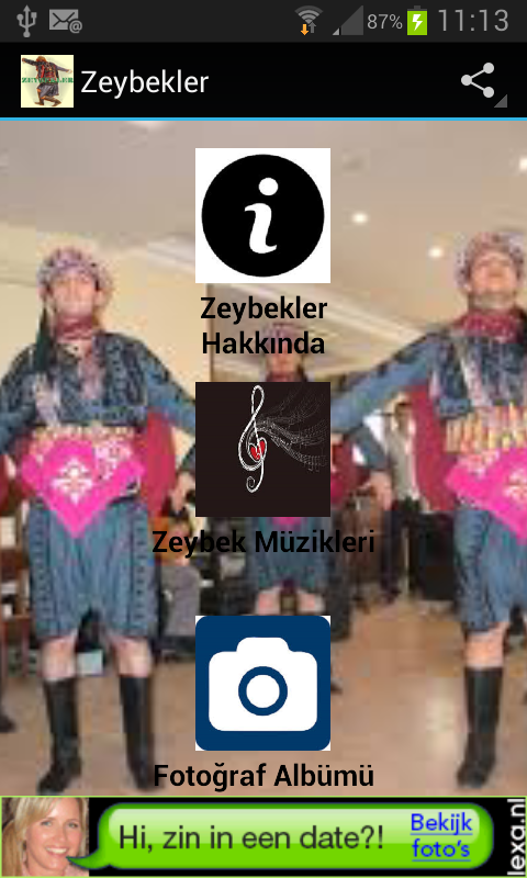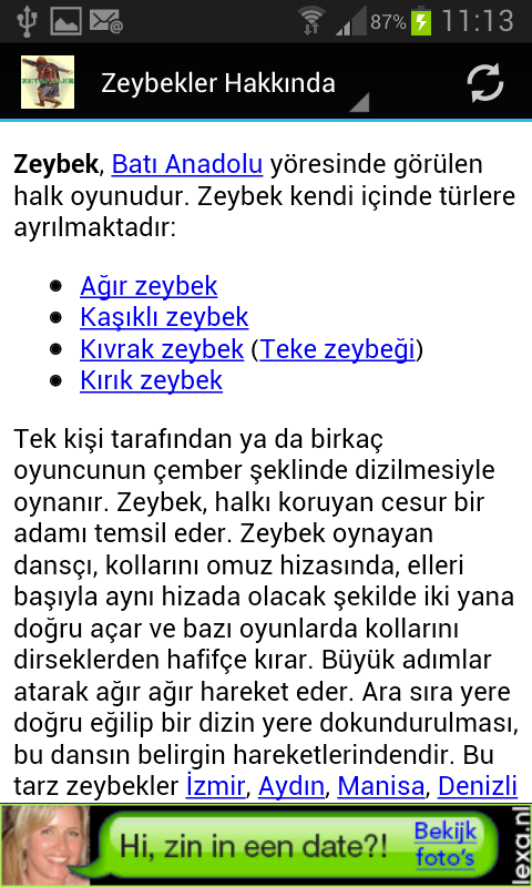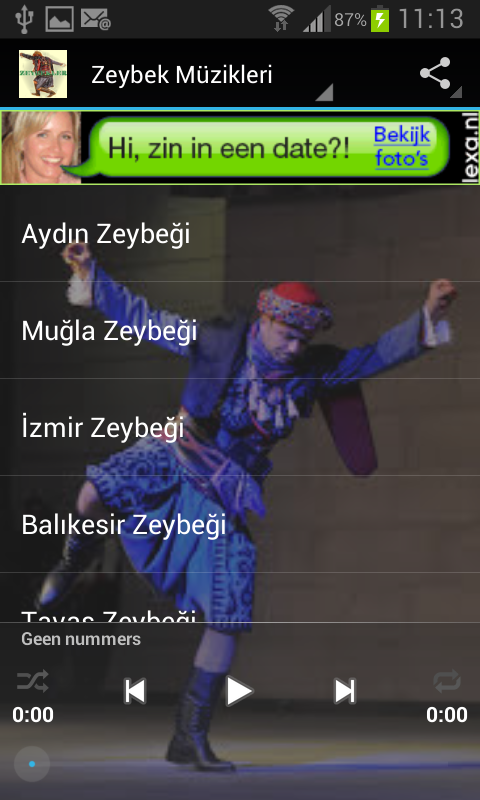 Bu uygulamada Ege Bölgesinin oyun türü olan zeybeklerden seçmeler bulacaksınız. Aydın, İzmir, Manisa gibi ağır zeybekler yanında daha hareketli oynanan zeybekleri zevkle dinleyebilir, dinletebilir, isterseniz zil sesi olarak kullanabilirsiniz.In this application you will find a selection of Aegean Region zeybek which game genre. Aydin, Izmir, Manisa can listen to relish more moving heavy zeybeks played alongside such zeybek can listen, you can use if you want as a ringtone.